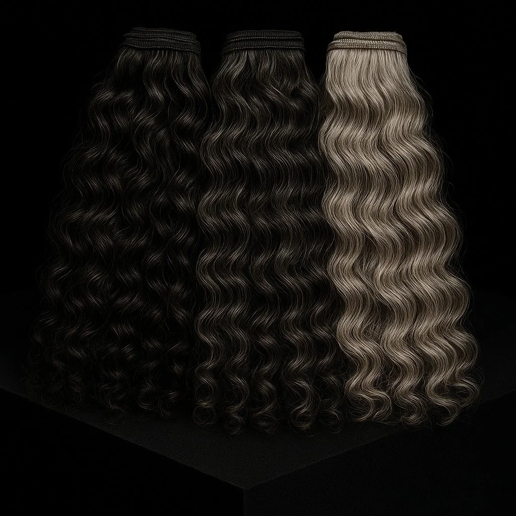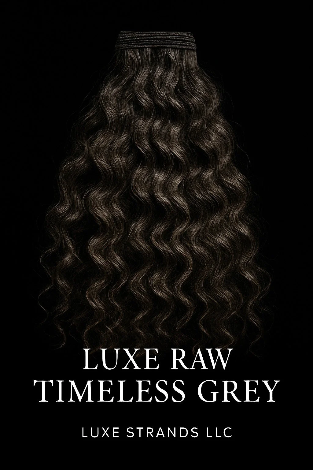Our Luxe Raw Timeless Grey collection is crafted from 100% raw Indian hair in natural shades of silver, ash, and charcoal—never dyed, never processed. Each bundle features a graceful salt-and-pepper hue, full of dimension and movement, available in soft Wavy and defined Curly textures.
